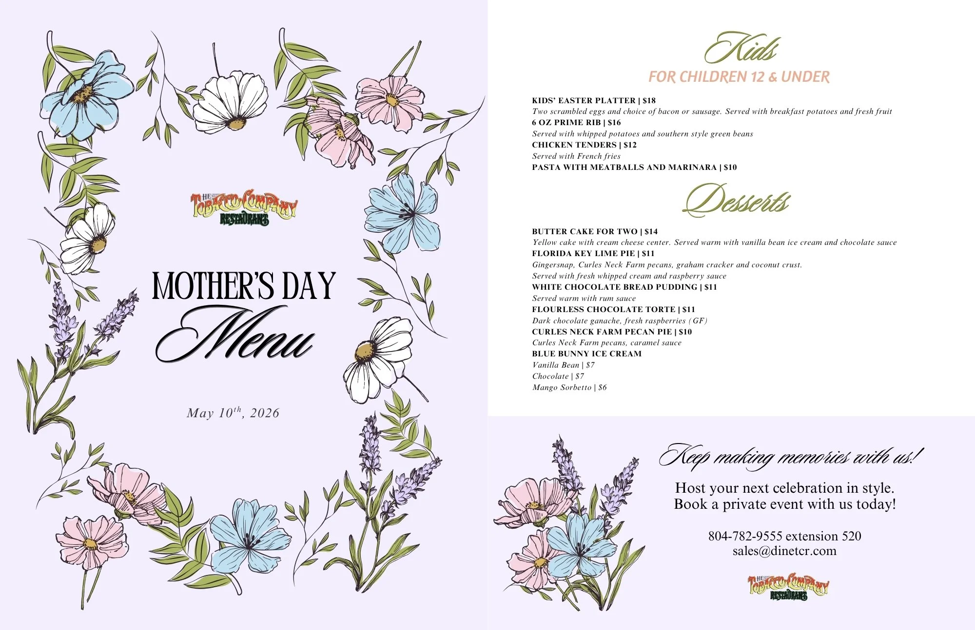 Reservations can be made by calling 804-782-9555 or online via OpenTable below. Please ensure to navigate to Sunday, May 10th using the widget below. Parties greater than 10 are not accepted.